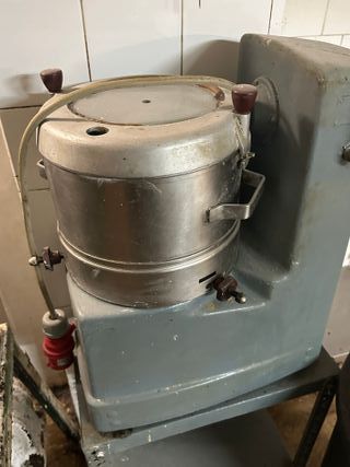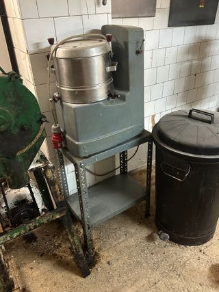 Molino de harina de uso industrial, con tolva superior y salida de producto. - Estructura metálica robusta. - Diseño cónico de la tolva. - Tubo de salida de material.