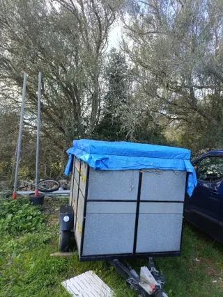 Remolque cerrado con estructura metálica y cubierta de lona azul. - Cubierta impermeable. - Estructura de metal resistente. - Rueda de repuesto.
