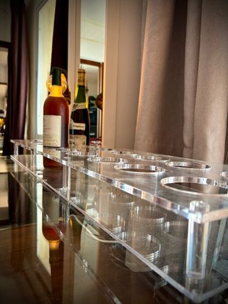 Pieza de diseño minimalista en doble placa de plexiglás transparente de alta densidad. No es un soporte común; es un activo de exhibición que juega con la luz de forma orgánica. Ideal para bodegas premium, estudios de diseño o coleccionistas que Tuscan una estética "Clean & Cinematic". Capacidad: 18 botellas (Presentación horizontal). Material: Metacrilato de lujo, resistente y de alta transparencia. Origen: Adquirido por 280€ para evento exclusivo. Motivo: Optimización de espacio en estudio de música. Precio: 100€ .Estado: Impecable. Se entrega libre de "polvo estelar" y listo para brillar. Recogida en Marivent (zona Farmacia).