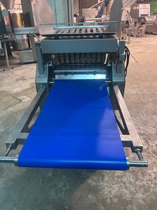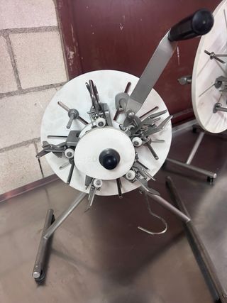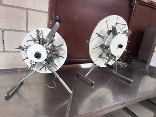 Máquina cortadora de chorizo de acero inoxidable y discos de plástico blanco. - Estructura metálica - Discos circulares con múltiples soportes. - Asa para manejo. Dos unidades. Cortadora pequeña 600€ y la cortadora grande 800€
