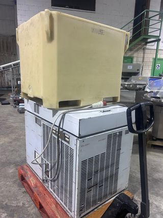 Equipo para la producción de hielo en escamas, ideal para la conservación de pescado y otros alimentos. - Depósito superior de plástico. - Unidad de refrigeración metálica.