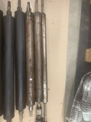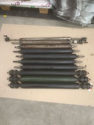 Conjunto de rodillos para imprenta Heidelberg de doble folio. Se compone de varios rodillos metálicos y de goma. - Rodillos metálicos con soportes. - Rodillos de goma de diferentes tamaños. - Un rodillo de color verde.