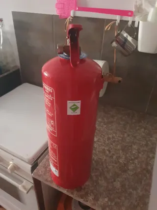 Extintor de incendios de polvo seco ABC, marca CALAFORRA. - Modelo: 27 A. - Apto para uso en tensiones de hasta 35 kV. - Fabricado por Talleres Calafarra.