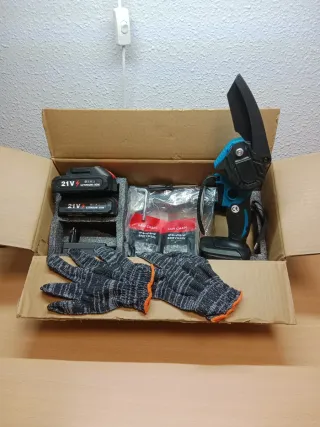 Mini motosierra eléctrica de 6 pulgadas nueva a estrenar, ideal para trabajos de jardinería y poda.nueva a estrenar ,Incluye todo lo necesario para empezar a usarla, botón de bloqueo e interruptor de seguridad-(ver todas las fotos). - Motosierra eléctrica. - 1 baterías de 21V. - Cargador de batería. - Cadena(dentro de la bolsa precintada) - Guantes de protección. Y llave tuerca y destornillador,manual de instrucciones