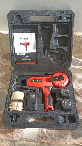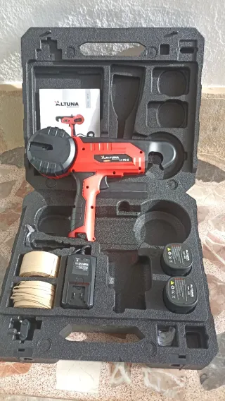 Atadora eléctrica profesional Altuna, modelo AB01-A, en su maletín. - Incluye atadora, cargador, dos baterías y rollo de alambre. - Maletín de transporte con compartimentos. Info: 629414065