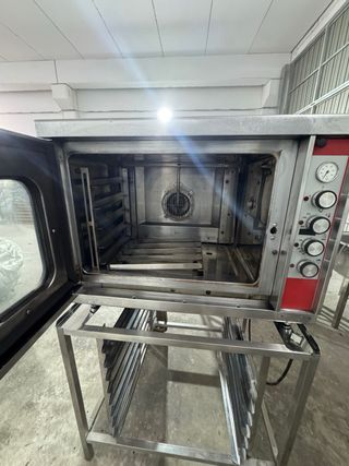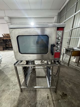 Horno industrial de acero inoxidable, ideal para panaderías, pastelerías o supermercados. Cuenta con un diseño robusto y profesional. - Puerta con ventana de cristal. - Panel de control con diales y manómetro. - Estructura metálica con bandejas. - Acabado en acero inoxidable. - Es de 5 bandejas Incluye base