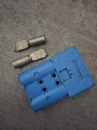 Conector de carretilla en color azul. Incluye dos terminales metálicos nuevos sin prensar. 320 amperios