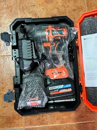 Protmex llavede impacto inalámbrica sin escobillas, 2 x 4,0 Ah, 21 Pistola de impacto con par máximo de 1200 Nm. Incluye: pistola, 2 baterías, cargador, 4 llaves, adaptador, instrucciones y caja. Abierta para prueba.