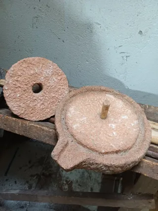 Muy antiguo Molino de piedra de 33 kg de peso para la produccion de aceite. Procedente de la zona de Quiroga con mas de 150 años y muchos kilos de aceituna molida .las muelas estan perfectamente asentadas y esta sin un solo defecto.se va echando las olivas por el hueco de la muela superior y se va girando.pasa mucha oliva para uso de una casa.tendria k enviarse en dos envios,cada muela en uno. Uno de 30kg y otro de 20kg. Merece la pena ,molinos de estos ya no se ven.impresionante para decoracion