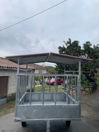 Remolque metálico con tejado, ideal para el ganado. Se vende remolque comedero, todo en hierro galvanizado. Medidas exteriores 1.70m x 1.70m, medidas interiores 1.62m x 1.62 Tejado de chapa trapezoidal, el tejado se puede quitar y poner. Chapa lisa de 3 mm Eje con estructura en hierro de 3 mm. El resto está hecho con hierro de 2 mm Wasap o llamadas 671814959