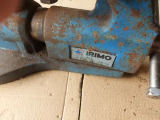 Tornillo de banco de la marca IRIMO, con una apertura máxima de 125 mm. - Color azul. - Cuerpo metálico con signos de óxido y suciedad, propios del uso. - Etiqueta de la marca visible con referencia y medida.