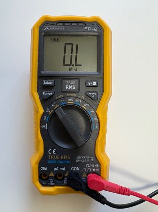 Multímetro digital Promax FP-2 con tecnología True RMS. Ideal para mediciones precisas. - Pantalla LCD con OL (Over Limit). - Función Auto Range. - Medición de Voltaje (V), Corriente (A, mA, µA) y Resistencia (Ω). - Incluye cables de prueba.