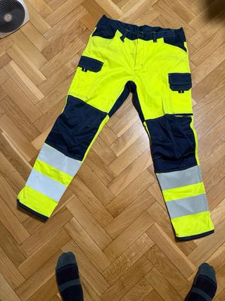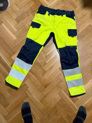 Pantalones de trabajo de alta visibilidad en color amarillo fluorescente y azul marino. - Diseño con múltiples bolsillos. - Bandas reflectantes plateadas en las piernas. - Cintura elástica.
