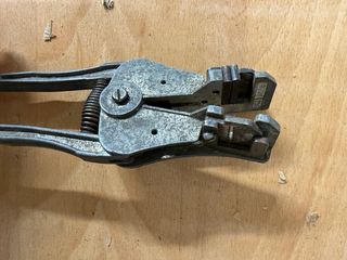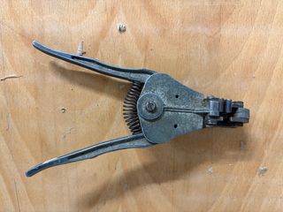 Herramienta clásica para pelar cables de forma automática. Tipo Stripmaster. Específicamente, parece ser un modelo vintage de la marca Ideal Industries, posiblemente con el número de patente Pat. No. 2,523,936 visible en el mango. Características principales Tipo de herramienta: Pelacables automático. Esta herramienta sujeta el cable y retira el aislamiento en un solo movimiento de presión. Marca/Modelo: Identificada visualmente como una herramienta Stripmaster de Ideal Industries. Uso: Se utiliza para quitar el aislamiento exterior de los cables eléctricos sin dañar el cond