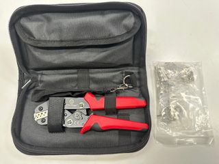 Kit de alicates de prensado de la marca Lion Rage, diseñado para trabajos de crimpado. - Incluye alicates con mangos de color rojo y negro. - Viene en una funda de tela negra con cremallera. - Se acompaña de un paquete de terminales metálicos.