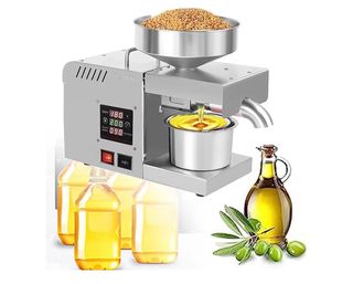 Prensa de aceite eléctrica para extraer aceites de diversas semillas y frutos secos. - Fabricada en acero inoxidable. - Pantalla digital para control de temperatura y tiempo. - Incluye recipiente para el aceite. - Diseño compacto y fácil de usar.