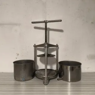 Prensa de aceite fabricada en acero inoxidable. Incluye dos recipientes. - Prensa con tornillo de ajuste. - Recipiente perforado. - Recipiente con salida. MÁS ARTÍCULOS EN MI PERFIL