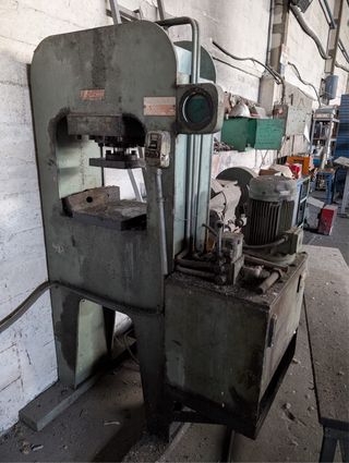 Potencia 40 Toneladas Trifásica 380 V. 2 HP Especial para Bakelita Puede troquelar, enderezar, doblar, embutir o prensar todo tipo de materiales. Dispone de extractor en la base y regulador de presión. 3 metros de altura total y ocupa 1 metro cuadrado de superficie aproximadamente. Peso 800 kg aprox. Se ha de desmontar en tres partes para poder moverla y cargarla, a cargo del comprador. Dispongo de vídeo descriptivo.