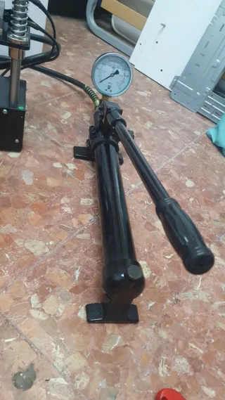 Prensa hidráulica diseñada para la extracción e inserción de bulones. Lleva un acople para usar de dobladora de tubos. El conjunto incluye la prensa, mangueras y conexiones. - Componente principal de color verde. - Cilindro de acción en color rojo. - Placas metálicas de soporte con rodillos. Precio 130€ Tef 687423038