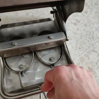 Máquina para prensar masa de pizza, ideal para preparar bases uniformes. - Construcción robusta en acero inoxidable. - Diseño compacto y funcional. - Mango ergonómico para facilitar el uso.