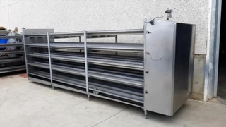 Si esta verdaderamente interesado en la máquina, pónganos en el chat, su número de teléfono o llámenos al +34 622451145 y le atenderemos en horario comercial 8.30-14.00—15.00-18.00h. Prensa horizontal para quesos. Fabricadas en su totalidad en acero inoxidable. Contiene 20 canales neumáticos para posicionamiento de los moldes de queso en vertical. Necesaria para prensar quesos a madurar, ya sean tiernos o con distinto grado de curación. Medidas del canal de prensado 4.500 mm largo x 280 mm alto x 280 mm ancho. Medias totales de la prensa largo 5.100 mm x 1.850 mm alto x 1.200 mm de ancho. Hay un stock de 3 unidades.