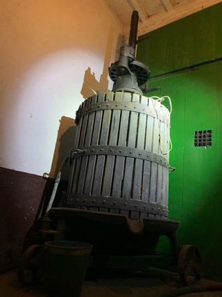 presan de vino antigua muy bien cuidada, con carro de hierro fundido para moverla.