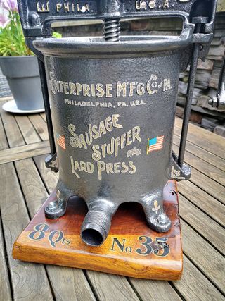 Prensa embutidora recién restaurada Made in U.S.A. Todos los mecanismos funcionando aunque se recomienda su uso sólo para decoración. Tiene más de 100 años Hierro y madera de roble. Toda la rotulación, incluida la de la base, se ha hecho a mano con pintura y pincel, excepto las dos banderas. Dimensiones de la base, 27 x 31 cm Altura variable con un máximo de 75 cm Diámetro de la cuba, 25 cm Profundidad de la cuba, 21 cm Capacidad, 8 cuartos de galón (7,6 litros) Pesa 21 kg. Ideal para DECORACIÓN INDUSTRIAL Escucho ofertas RAZONABLES
