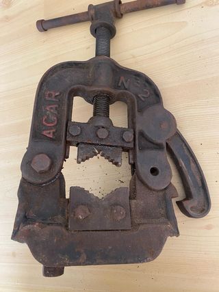 Prensa de fundición antigua para sujetar tubos. Mordaza de apriete, de soporte de taller. Prensa de tuberías, de Fontanero. - Marca: ACAR - Modelo: N.º 2 - Material: Hierro fundido