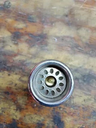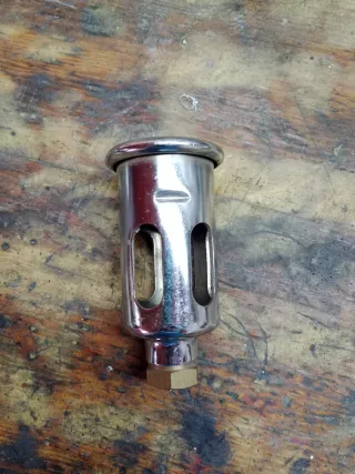 Pieza metálica con acabado brillante y detalles en latón. - Cuerpo cilíndrico con aberturas. - Parte superior redondeada. - Conexión roscada en la base.