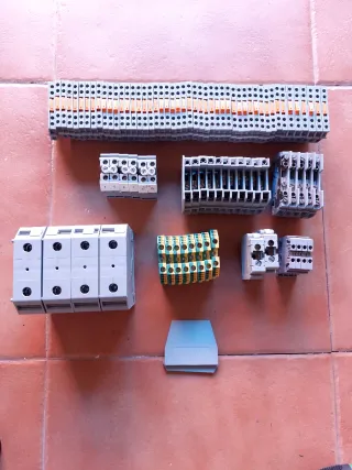 Lote de bornas para carril DIN de diferentes modelos y marcas. Ideales para instalaciones eléctricas y cuadros. Tipos: - 48 ud UDK-4-MKT Phoenix contact. - 4 ud URTK/S Phoenix contact. - 10 ud URTK/S BEN Phoeniz contact. - 4 ud. M4/6-5116 Entrelec - 2 ud. UK25 Phonix Klemmen. - 6 ud. UK10N Phoenix contact. - 8 ud. WPE6 Weidmüller. - 4 ud. UKH 95 Phoenix contact. - Tapas para finales de bornas. - Componentes para montaje en carril DIN.