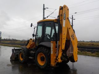 Retroexcavadora JCB 3CX en color amarillo. - Cabina cerrada. - Brazos de carga y retro. - Neumáticos todoterreno. Brazo extensible Linea de martillo Cuchara de almeja