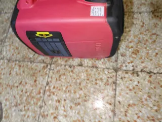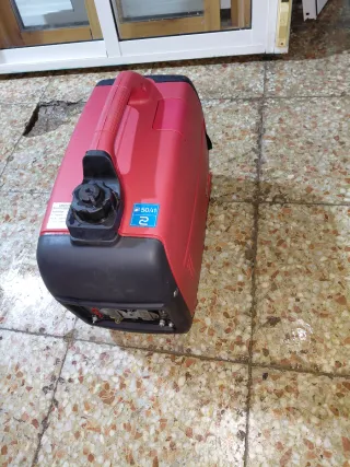 Generador de luz portátil de color rojo con detalles en negro. Ideal para tener energía en cualquier lugar. - Asa de transporte integrada. - Tapón de combustible. - Indicador de nivel de combustible.