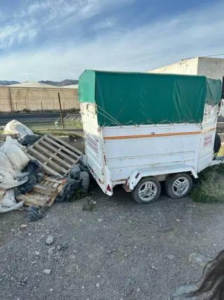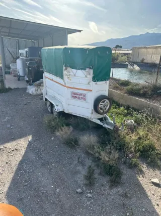 Remolque blanco para transporte de animales vivos, con lona verde. - Señalización TRANSPORTE DE ANIMALES VIVOS. - Rueda de repuesto incluida. -Van de matrícula blanca con separadores. Interior 1'50 m -Papeles al día, lona nueva, es muy ligero con puerta trasera en rampa y lateral. La puerta delantera abertura lateral con la ventaja de que puede entrar y salir el animal. -Freno Inercia