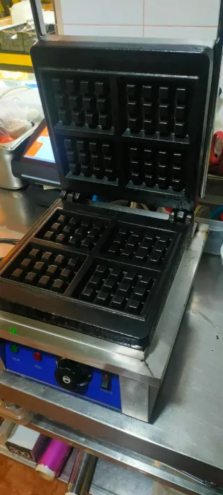 Máquina de gofres de acero inoxidable, ideal para hostelería. - Placas antiadherentes. - Control de temperatura. - Indicador luminoso de encendido y listo.