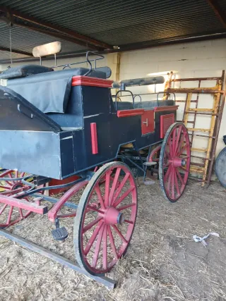 Coche de caballos de estilo clásico, ideal para eventos o coleccionistas. Presenta un diseño robusto y detalles en rojo y negro. - Asientos acolchados para varios pasajeros. - Ruedas grandes con radios. - Estructura de madera y metal. Cambio por algo que me interese.