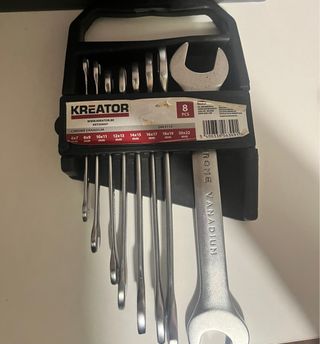 Set de 8 llaves inglesas de la marca KREATOR. - Fabricadas en Chrome Vanadium. - Incluye medidas: 6x7, 8x9, 10x11, 12x13, 14x15, 16x17, 18x19 y 20x22 mm. - Cumplen con la norma DIN 3110.