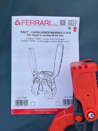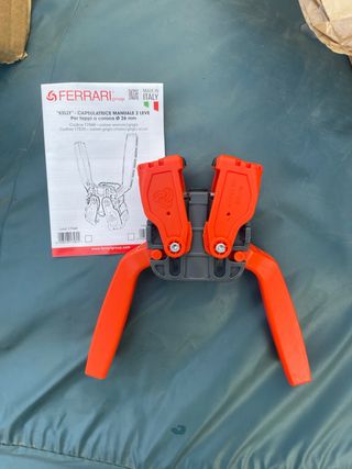Taponadora manual Ferrari modelo Kelly con dos palancas. - Diseñada para tapones de corona de 26 mm. - Color naranja y gris. - Fabricada en Italia.