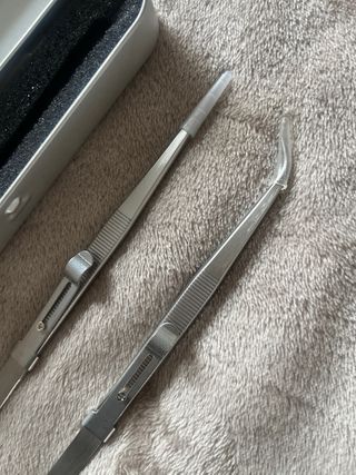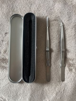 Set de pinzas de precisión de acero inoxidable, ideal para trabajos delicados. Incluye un estuche protector. - Dos pinzas incluidas. - Una pinza con punta recta. - Una pinza con punta curva. - Estuche metálico con interior de espuma.