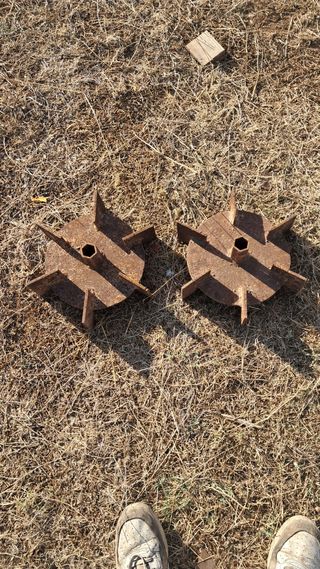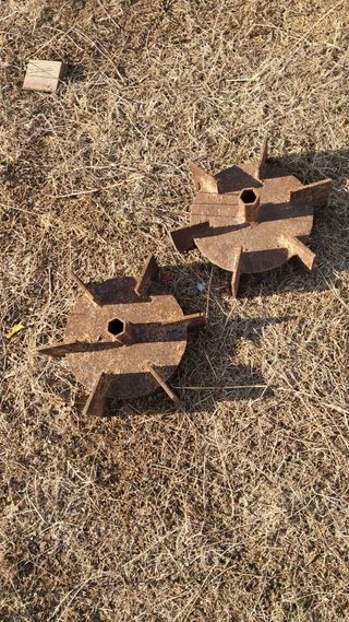 Se venden dos ruedas de hierro, ideales para maquinaria agrícola o de jardín. Su diseño robusto las hace perfectas para trabajos exigentes. - Material: Hierro fundido. - Diámetro aproximado: [insertar diámetro si se conoce]. - Eje central hexagonal.