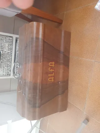Tapa de madera para máquina de coser Alfa. Protege tu máquina con estilo. - Diseño curvo y elegante. - Acabado en madera veteada. - Asa metálica para fácil transporte.