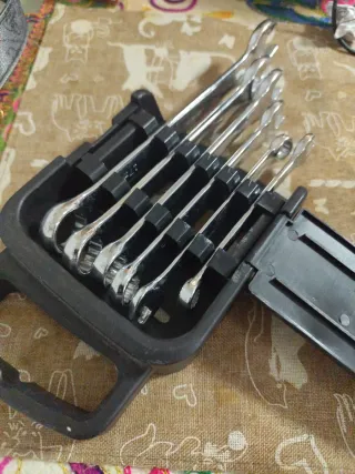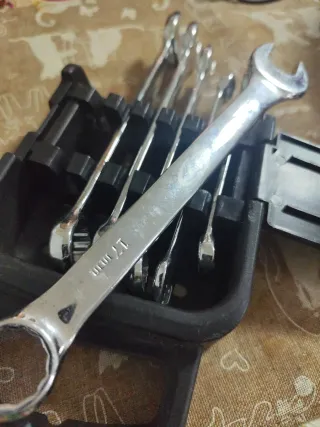 Set de llaves fijas de metal cromado. Incluye varias medidas para diferentes usos. - Material: Metal cromado. - Diseño: Llaves fijas. - Soporte: Incluye caja organizadora de plástico negro. De la 8 a la 17