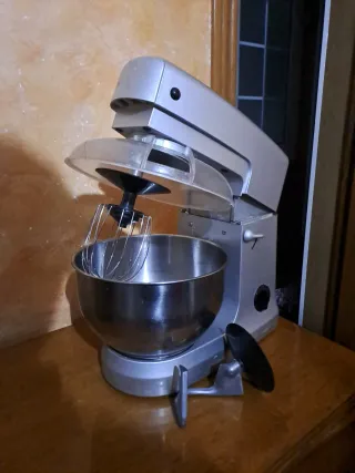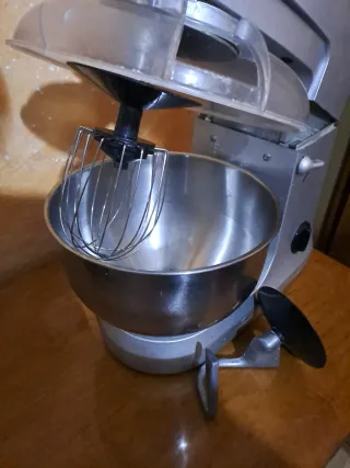Batidora amasadora de color plateado con bol de acero inoxidable. - Incluye varillas y gancho. - Protector de plástico transparente.