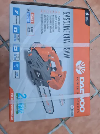 Motosierra Daewoo DACS2612 con motor de gasolina de 2 tiempos. - Potencia: 0.9 kW. - Cilindrada: 25.4 cc. - Capacidad depósito combustible: 190 ml. - Capacidad depósito aceite: 150 ml. - Bajo nivel de vibración. - Espada de 12. - No negociable. - No cambios.