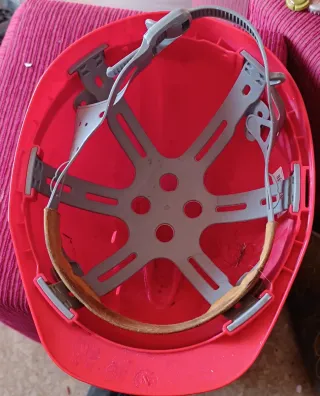 Casco de seguridad de color rojo, diseñado para protección en trabajos. - Fabricado en material resistente. - Interior con arnés ajustable. - Diseño ergonómico.