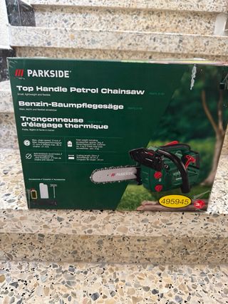 Motosierra de poda Parkside con motor de gasolina. Es ligera y fácil de manejar. - Longitud de corte: 20 cm. - Velocidad máxima de cadena: 21 m/s. - Peso total con accesorios: 4 kg. Nueva a estrenar