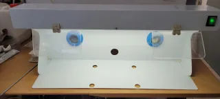 Mueble diseñado para colocar una pulidora. - Estructura blanca. - Laterales transparentes. - Interruptor verde encendido.