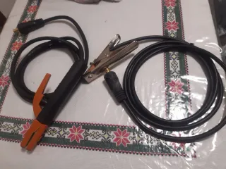 Conjunto de cable de soldadura con pinza de masa. - Cable de soldadura negro. - Pinza de masa con mango naranja y pinza metálica.