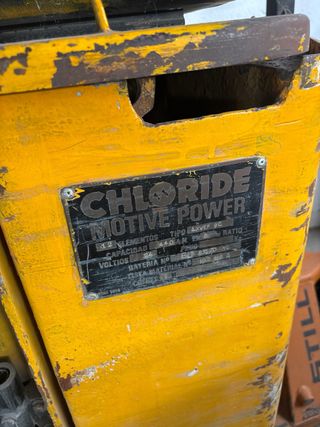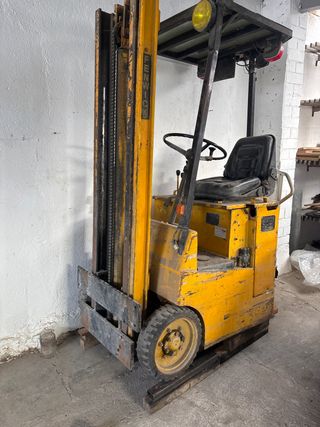 Carretilla elevadora eléctrica marca Fenwick. - Color amarillo. - Asiento del conductor. - Rueda delantera. - Mástil de elevación.