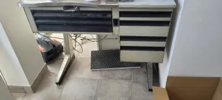 Máquina de coser industrial tipo overlock. Ideal para acabados profesionales en textiles. - Estructura robusta para uso intensivo. - Incluye mesa de trabajo. - Pedal de control.