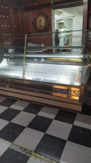 Vitrina expositora con acabado en acero inoxidable y detalles dorados. Ideal para negocios. Medidas: Larga 2'10. Alta 1'35. Ancho 1,10h - Diseño moderno y elegante. - Superficie de exposición amplia. - Estructura robusta. Ubicada en Xerta (Tarragona)